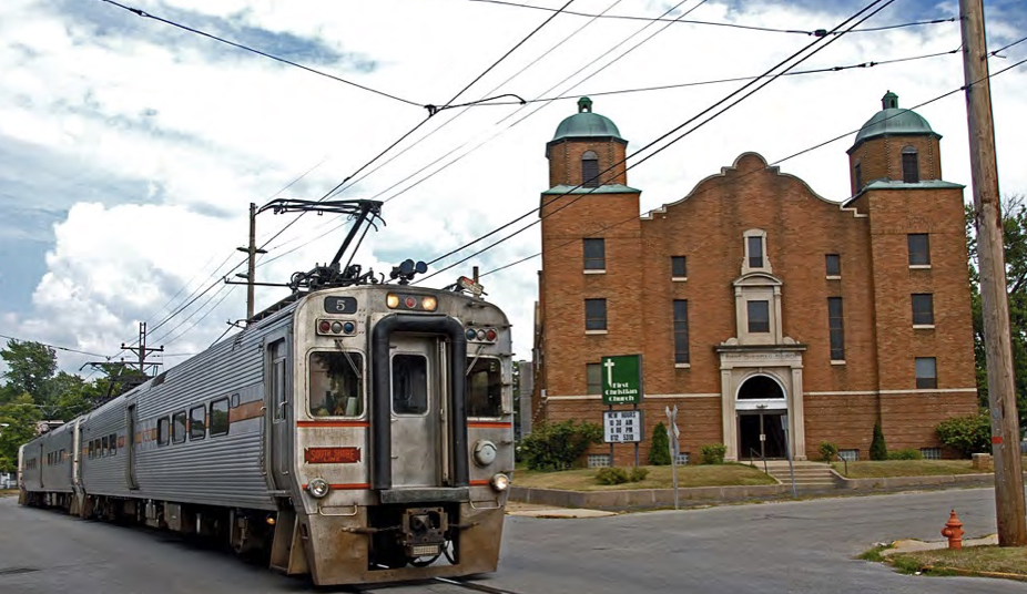 South Shore Line train and First Christian Church, Michigan City, Indiana.