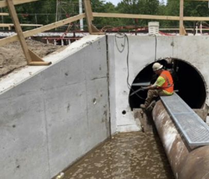 Linear infrastructure often presents a barrier to movement for wildlife. During the Double Track project planning stage, a great deal of consideration was given to protecting natural resources during and after construction. One example is the installation of wildlife shelves within the larger culverts, such as this one at Weiland Ditch. Thanks to coordination with the Indiana Department of Natural Resources, National Park Service, US Fish and Wildlife Service and others, these shelves are now being installed as the last work is nearing completion on the larger culverts.