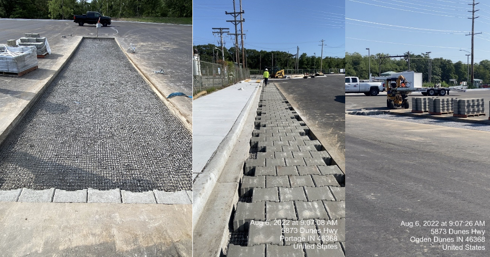 Impermeable surfaces, which include materials such as concrete, asphalt, and traditional pavers, do not allow stormwater to penetrate into the ground. This forces the water to run off the impermeable surface, which can lead to flooding, erosion, and pollution of surface water – especially during significant rain events. To avoid and mitigate issues from stormwater runoff, NICTD is using permeable interlocking concrete pavers (PICP) at strategic locations at the Miller Station, the Portage/Ogden Dunes Station, and the Dune Park Station. This decision was made in the best interest of the important natural environments surrounding these stations, most notably the Indiana Dunes National Park. These interlocking cellular concrete blocks have an arched storage chamber for additional water capacity on the underside of the block. Once stormwater drains through the tiny spaces between the blocks, it is temporarily held in the arched storage chamber before naturally seeping into the ground.
