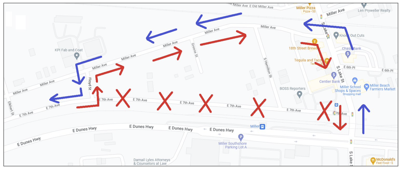 The Northern Indiana Commuter Transportation District (NICTD), operator of the South Shore Line railroad, will temporarily close and detour 7th Avenue between Floyd and Lake Street on Thursday, May 19, 2022. Eastbound traffic would follow the red arrows. Westbound traffic would follow the blue arrows. The detour is expected to run through June 30, 2022, but could push to July 19 depending on construction progress.