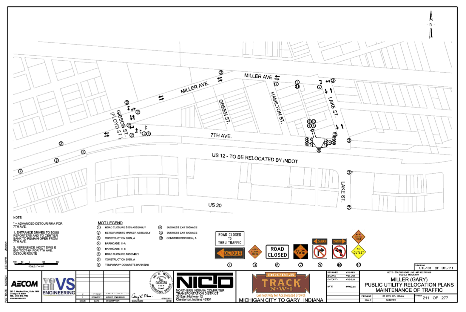 The work is necessary for NICTD’s Double Track Northwest Indiana (DT- NWI) construction project. The detour will use Floyd Street and Miller Avenue as shown. There will be restrictions on Old US 12, but access to NICTD’s Miller Station will be maintained.